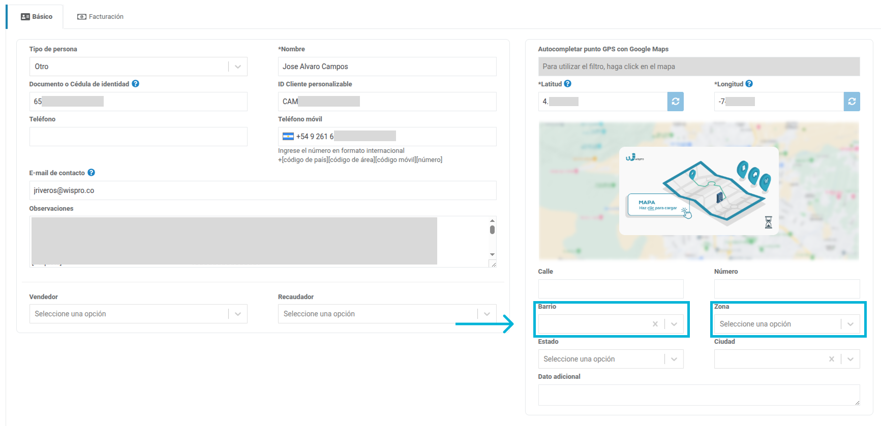 - Ubicar los campos Zona y Barrio dentro de los datos del cliente.