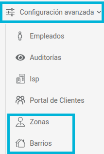 Las zonas y barrios se administran desde el apartado de configuración avanzada > Zonas / Barrios.