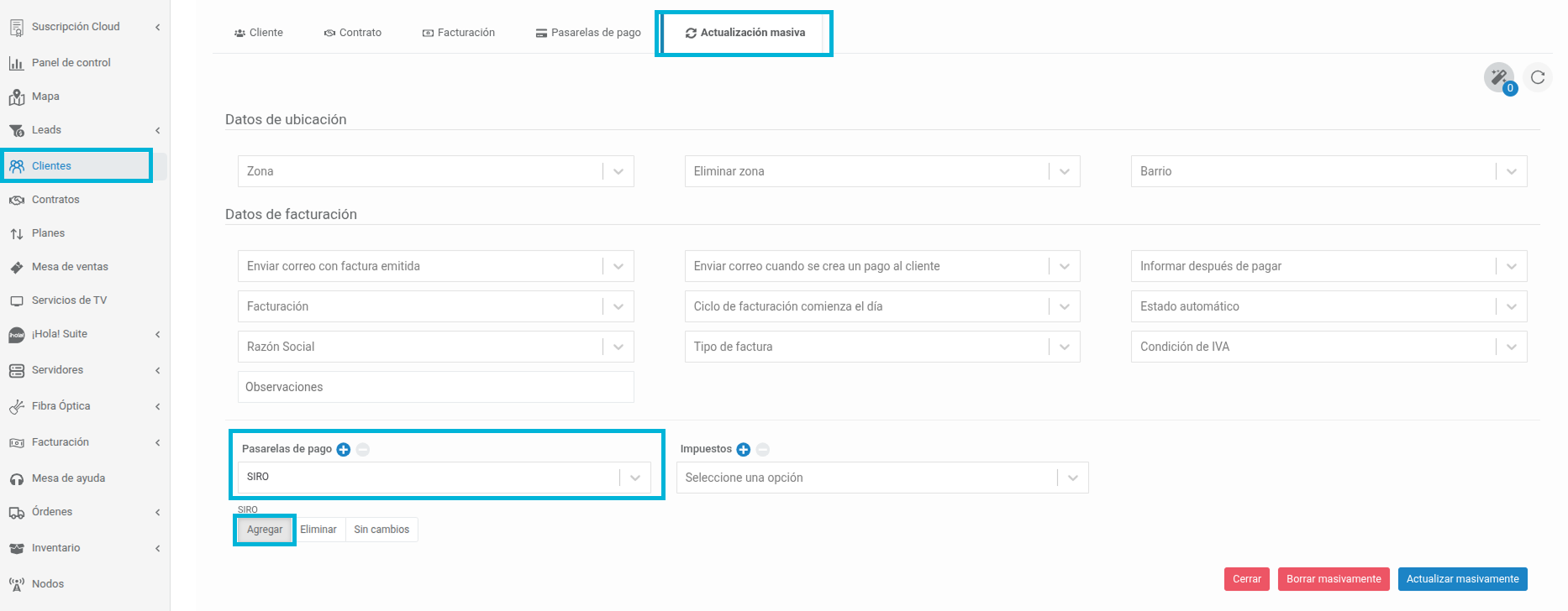 Si necesitás activar la pasarela de pago SIRO en varios clientes en simultáneo, podés hacerlo de manera rápida desde la actualización masiva. Te explicamos cómo hacerlo paso a paso.