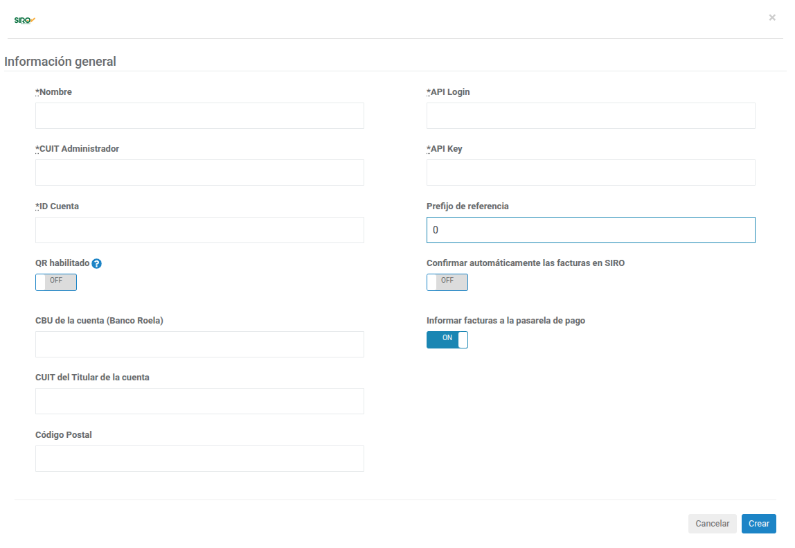 Al momento de solicitar la creación de la pasarela de pago SIRO dentro de Wispro, el sistema requerirá completar una serie de campos obligatorios. Cada uno de ellos cumple una función específica para establecer la comunicación entre Wispro y SIRO de forma segura y automática.