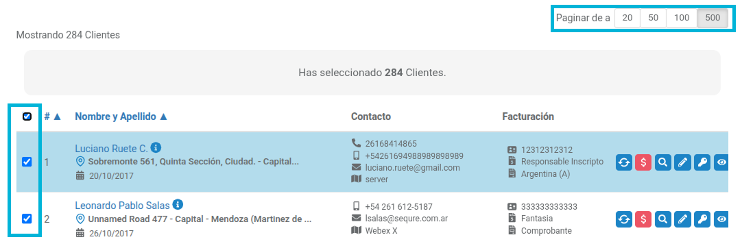 - Es posible paginar de 20, 50, 100 o 500 clientes por página.