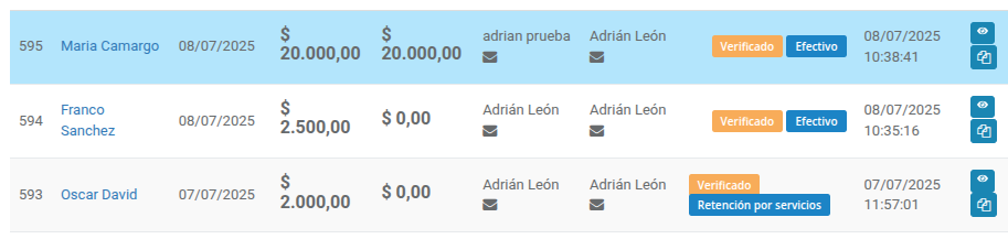 Luego, al ingresar al módulo Pagos, estos registros se mostrarán con una etiqueta amarilla que indica Verificado, para que puedas identificar rápidamente qué pagos ya fueron contemplados dentro de un arqueo.