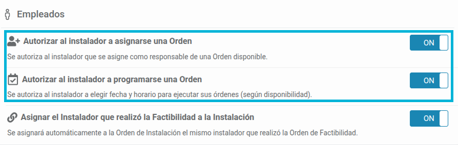 Para que un instalador pueda asignarse o programarse órdenes desde la app, es indispensable que en la configuración de órdenes se encuentren activadas las siguientes opciones: