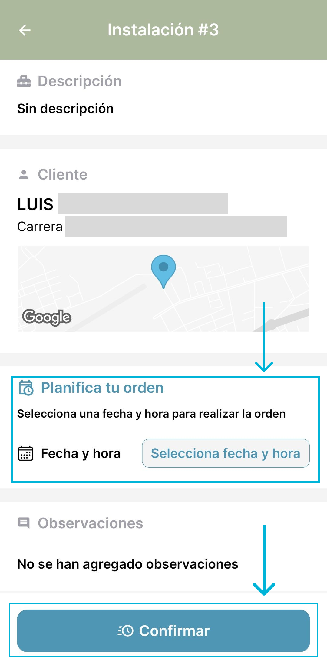 - Accede al detalle de la orden, donde podrá visualizar información del cliente y la ubicación.