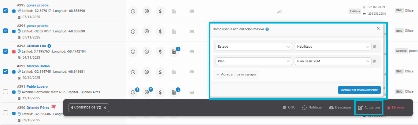 Gracias a la actualización masiva, puede realizar una búsqueda en sus contratos con algún indicador, y actualizar todos los contratos de una sola vez. Por ej. trasladar contratos de un servidor a otro y modificarles el estado de habilitado, degradado, etc.)