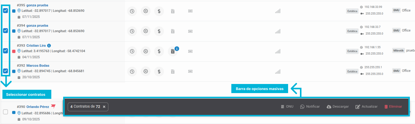 A la izquierda de cada contrato se encuentra un recuadro seleccionable. Al marcar uno o más contratos, se despliega una barra gris inferior con acciones masivas disponibles.