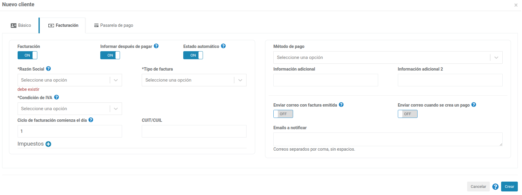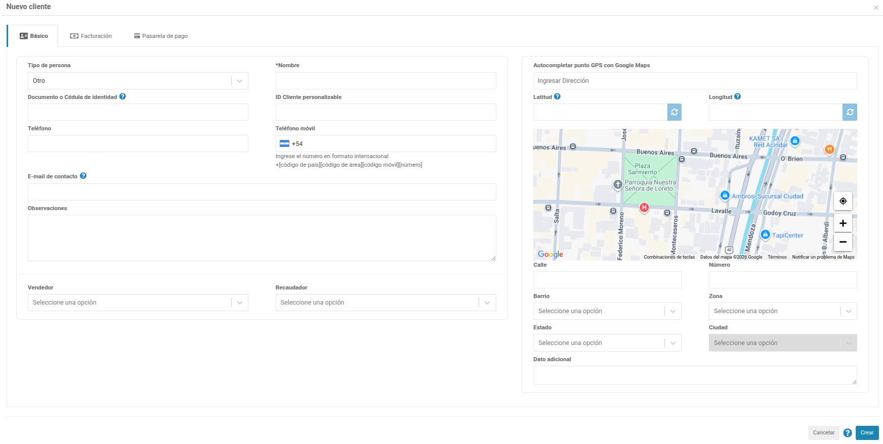 Cuando completes la información necesaria en las pestañas correspondientes, hacé clic en Crear para guardar el nuevo cliente.