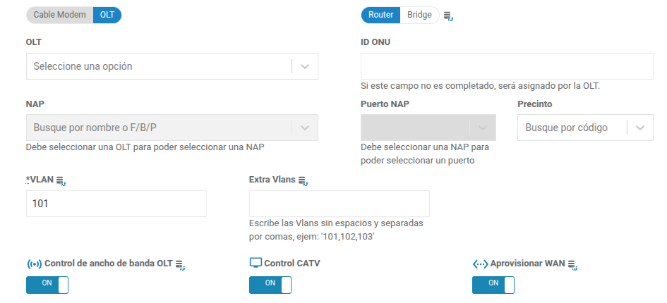 - Control CATV: Switch para habilitar el control automático de CATV en el contrato y OLT.