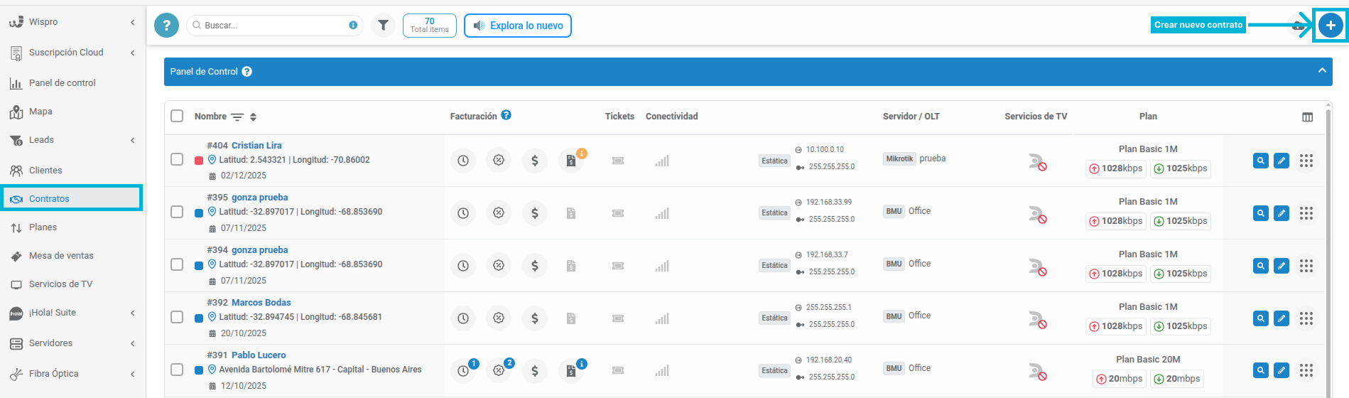 Los contratos en Wispro representan la relación activa de servicio entre un cliente y el ISP. A través de un contrato se definen los parámetros comerciales, de facturación y de red que permiten automatizar la operación diaria.