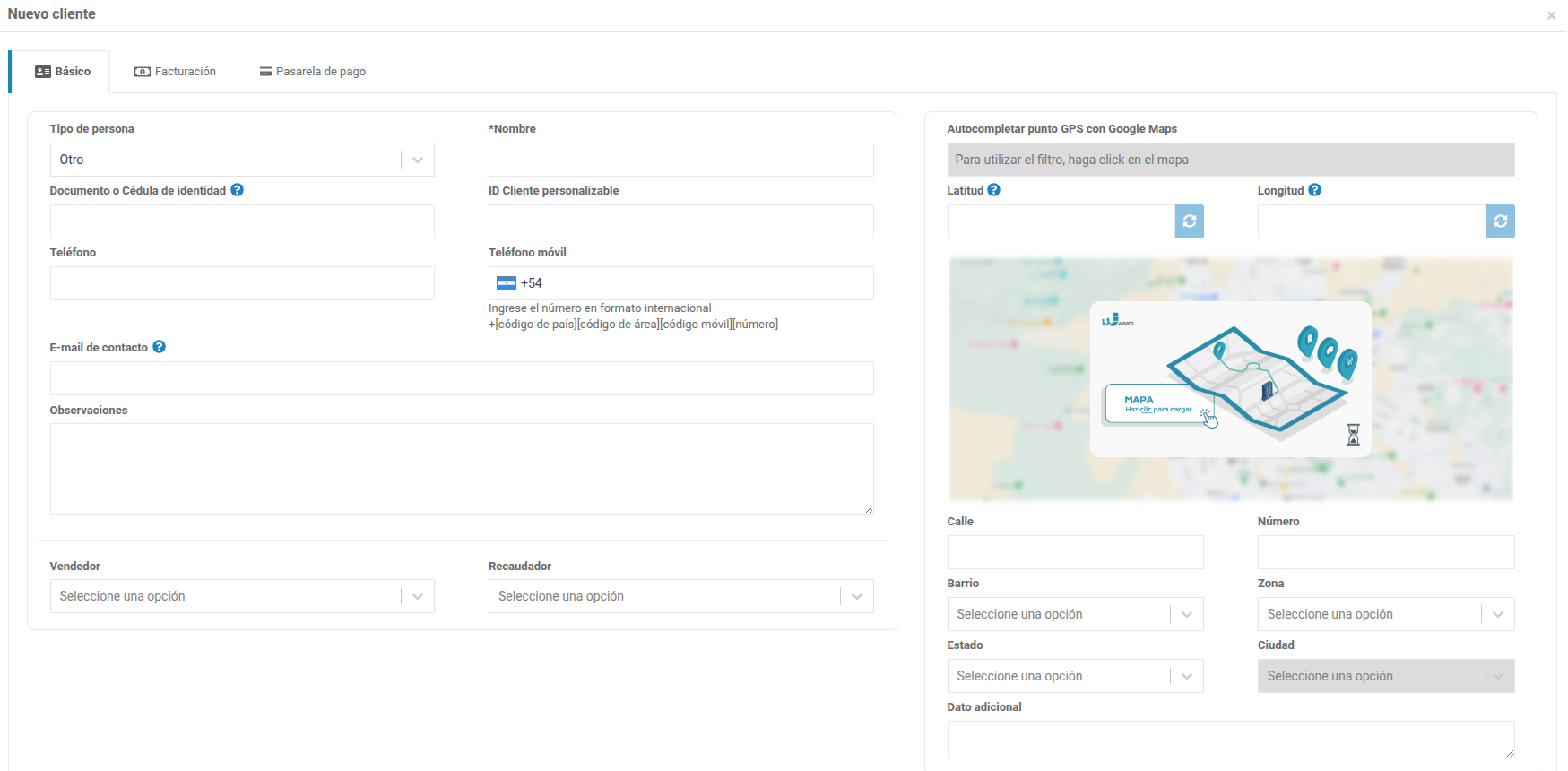 Arriba a la derecha encontrará el botón Crear nuevo cliente. Allí podrá completar los datos de cada abonado y especificar las configuraciones individuales. Los datos requeridos en la pestaña Básico son:
