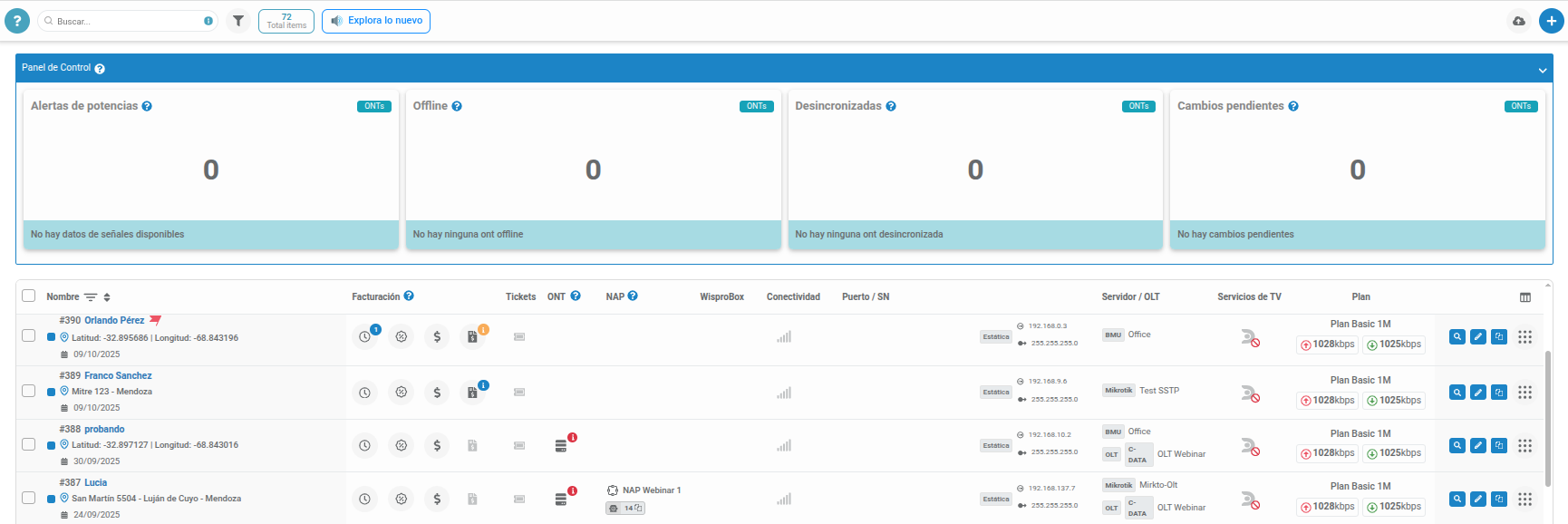 En la parte superior se encuentra el Panel de Control, que muestra indicadores en tiempo real relacionados con las ONTs (equipos de cliente). Los apartados principales son: