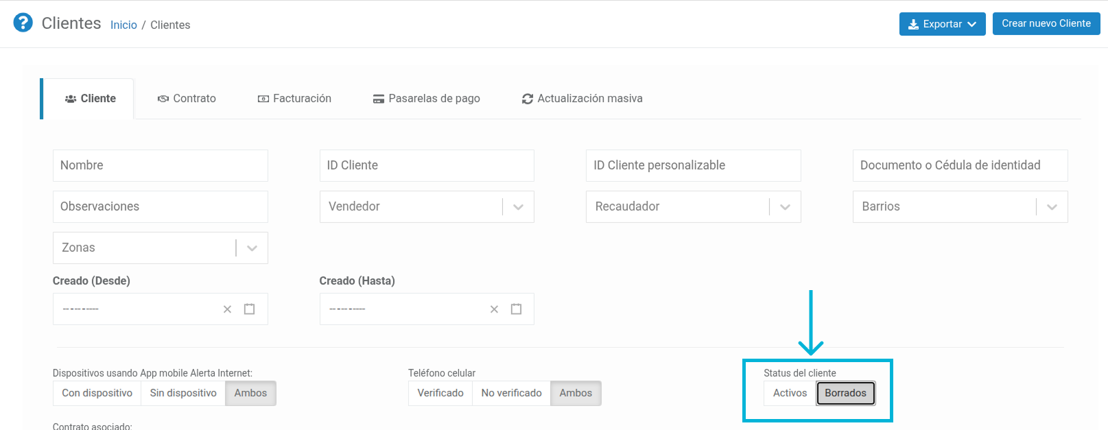 - Aplicar el filtro Status del cliente > Borrados.