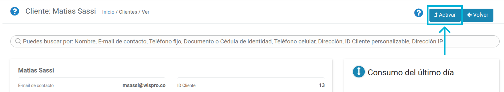 Al aplicar este filtro, Wispro mostrará los clientes que fueron desactivados.