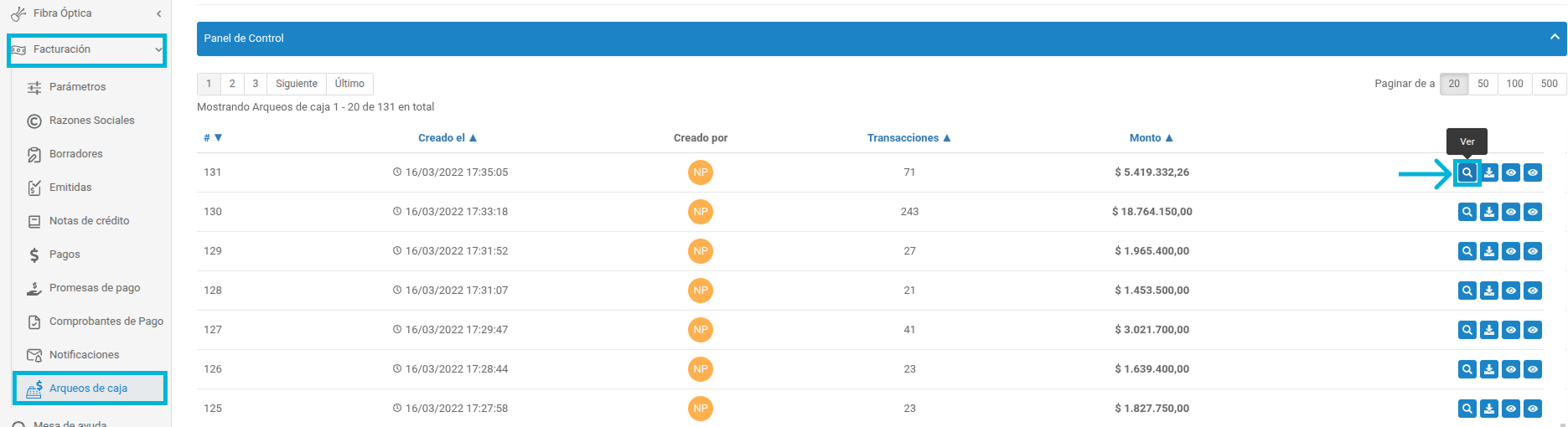 Buscá el arqueo donde se encuentra el pago y seleccionar la opción "ver".