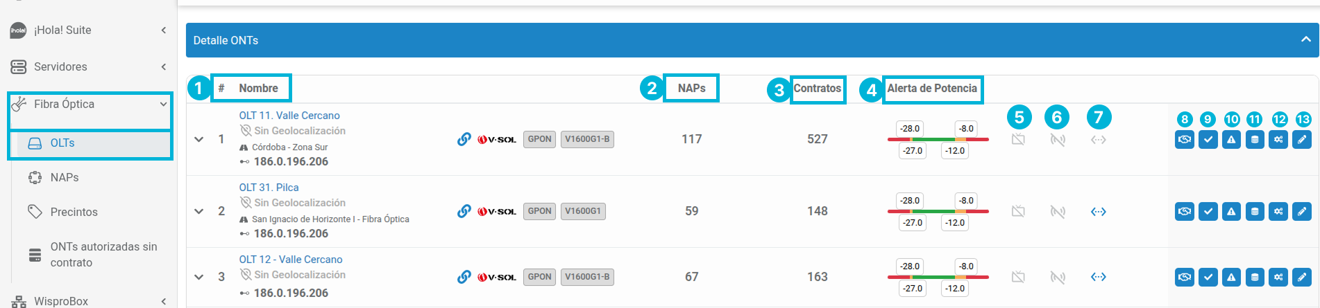 En esta vista se muestra el listado de OLTs junto con sus datos principales y accesos rápidos.