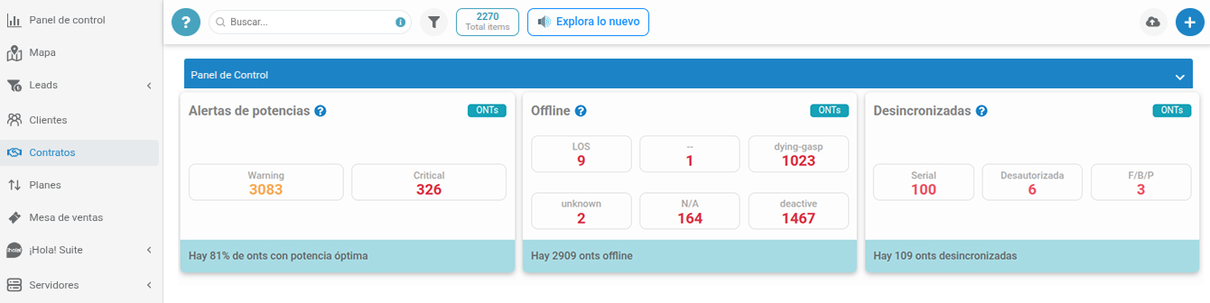 Al ingresar a Contratos , en la parte superior encontrará un rectángulo azul titulado Panel de control. Despléguelo desde ">" y encontrará 3 indicadores para conocer de un vistazo el estado de sus ONTs.