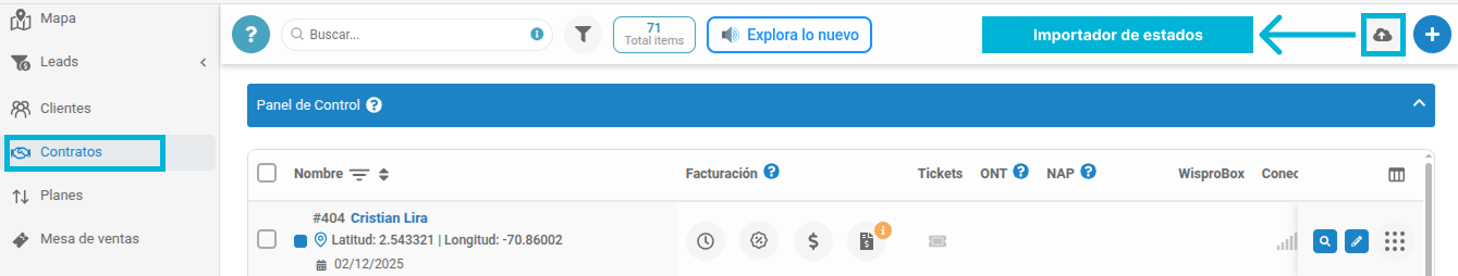 La función Importador de estados permite actualizar de forma masiva el estado de los contratos dentro de Wispro. Esto resulta útil cuando se requiere modificar el estado de muchos contratos de manera rápida y ordenada.