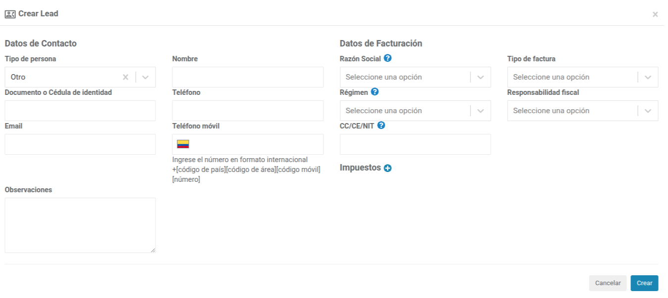 Para crear nuevos leads desde el apartado Leads presione el botón (+) ubicado en el margen superior derecho. Se abrirá una nueva ventana en la cual debemos cargar los siguientes datos:
