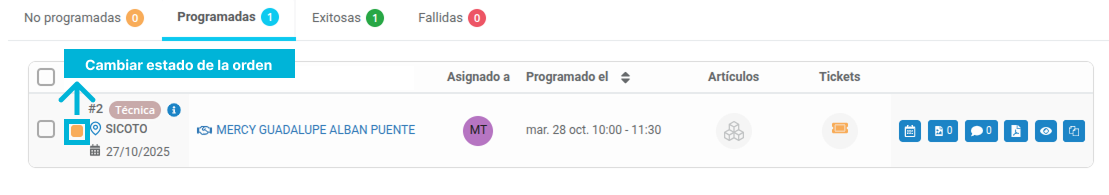 En el listado, hacer clic en el recuadro ubicado a la izquierda de la orden (por defecto puede verse en color amarillo con estado Pendiente).