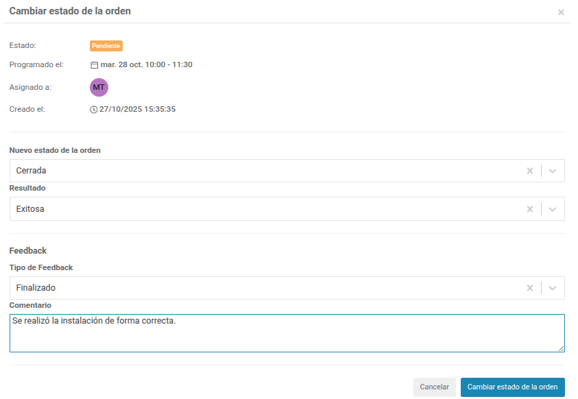 Para confirmar, hacer clic en Cambiar estado de la orden.