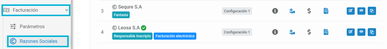 En la visual general desde Facturación > Razones sociales, podrá ver rápidamente qué configuración tiene cada razón social y sus acciones habilitadas/deshabilitadas.