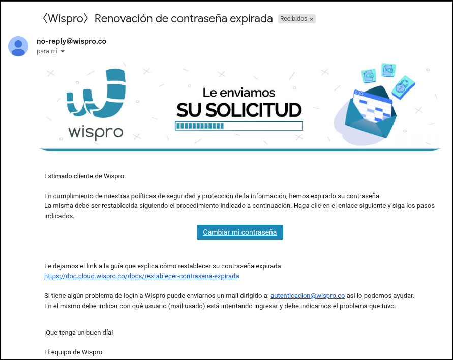 Por motivos de seguridad y en cumplimiento de buenas prácticas, Wispro implementa un sistema de expiración de contraseñas. Esto significa que, luego de un tiempo determinado (definido por Wispro), las contraseñas de acceso expiran y el usuario deberá establecer una nueva para continuar utilizando el sistema.