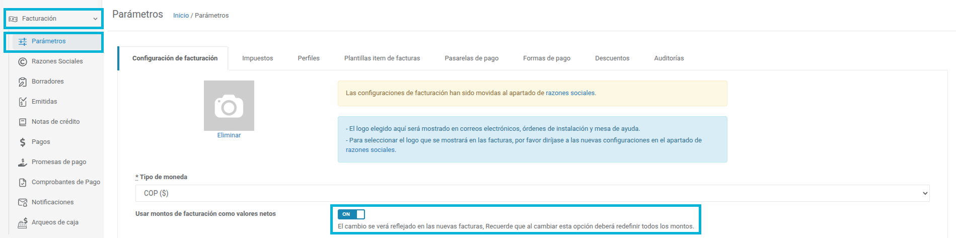 Sin la activación de "Usar montos de facturación como valores netos", no podrá integrar Siigo. Una vez habilitados, no hay vuelta atrás.Esta funcionalidad la puede habilitar solamente un soportista.