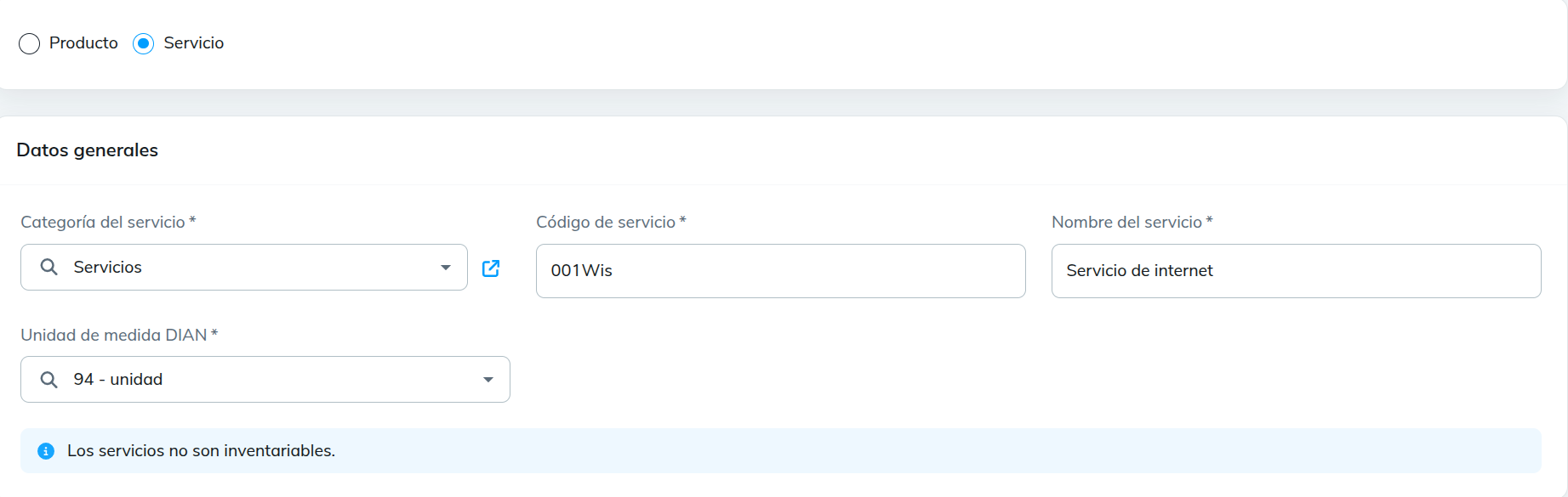 - Código de servicio: ingresar un código personalizado para identificar el servicio.