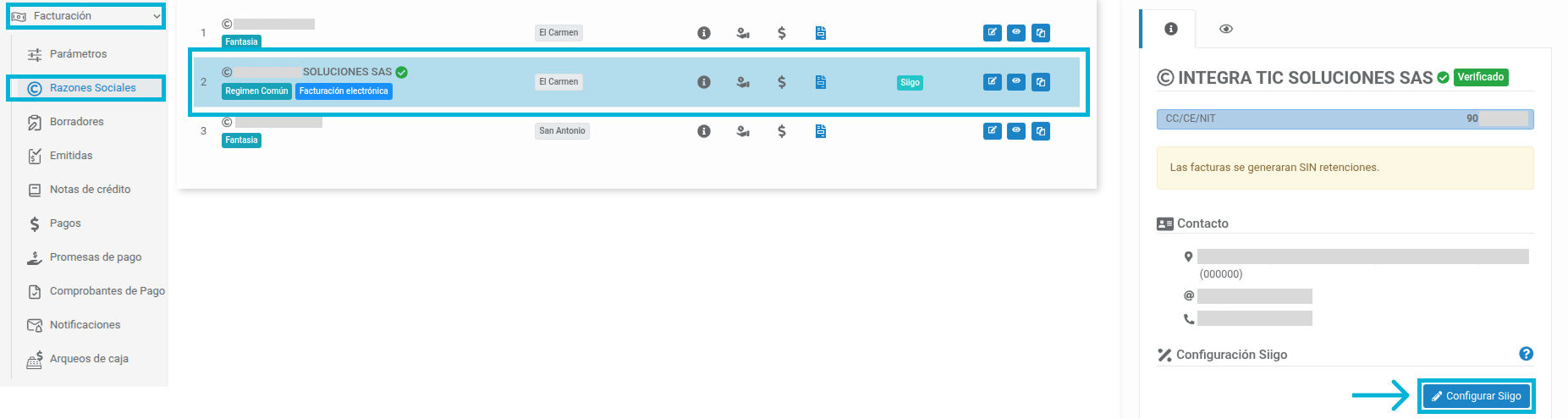 Luego de crear la razón social se debe corroborar que los datos de acceso sean correctos. Cliquee el botón de Configurar Siigo:
