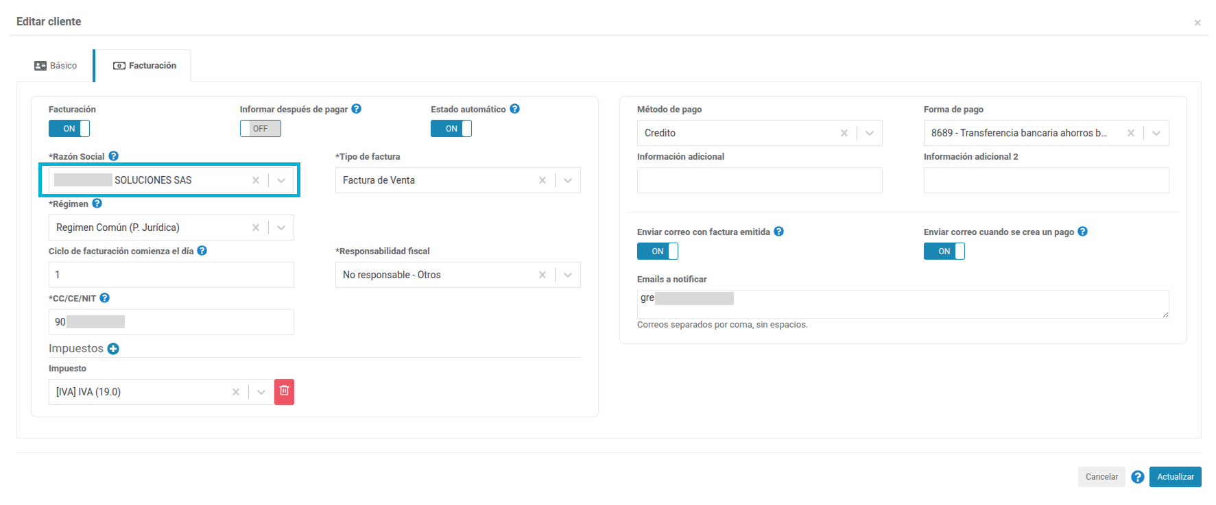Desde el menú Clientes > (selección de cliente) Editar > Facturación > campo Razón social, debe seleccionar el nombre de la razón social que creó para la integración con Siigo.