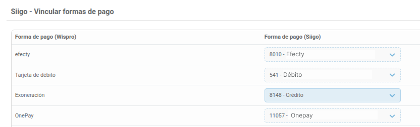 - Para cada forma de pago de Wispro (por ejemplo Efecty, OnePay, Transferencia, etc.), seleccione su equivalente en Siigo.