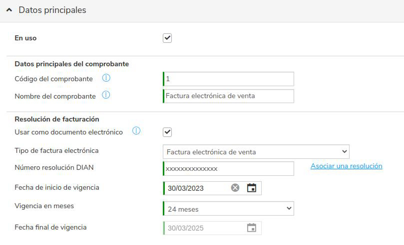 Verifique que el comprobante correspondiente a la Factura electrónica de venta se encuentre correctamente configurado en Siigo. Para conocer el procedimiento de configuración, puede consultar el video explicativo de Siigo en "Configurar tu factura de venta electrónica"