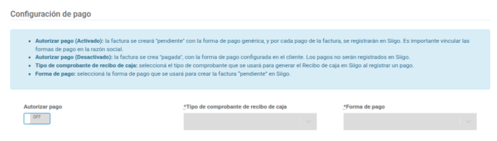 Si activa Autorizar pago, es necesario configurar en SIIGOy luego registrarlo en Wispro: