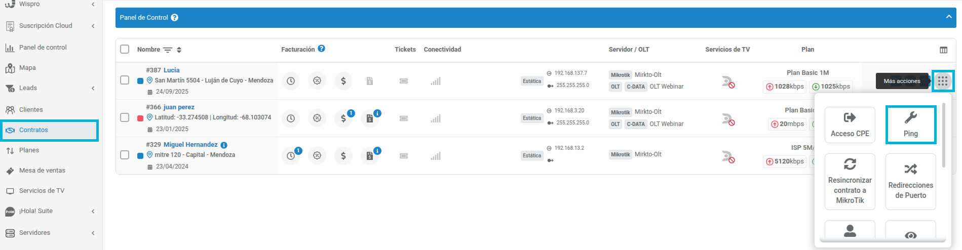 El Test de PING te permite chequear el estado de conexión desde el servidor MikroTik hasta la IP del contrato del cliente, para validar si hay respuesta desde el equipo hacia esa IP.